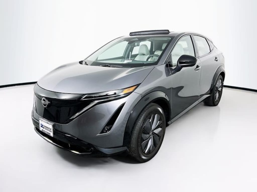 Certified. Gun Metallic 2023 Nissan Ariya EVOLVE+ e-4ORCE AWD CVT Electric Motor 19" Alloy Wheels, 4-Wheel Disc Brakes, 6 Speakers, 8.896/7.679 Final Drive Ratio, ABS brakes, Air Conditioning, Alloy wheels, AM/FM radio: SiriusXM, Auto High-beam Headlights, Automatic temperature control, Brake assist, Bumpers: body-color, Delay-off headlights, Driver door bin, Driver vanity mirror, Dual front impact airbags, Dual front side impact airbags, Electronic Stability Control, Emergency communication system: NissanConnect EV & Services, Four wheel independent suspension, Front anti-roll bar, Front Bucket Seats, Front Center Armrest, Front dual zone A/C, Front fog lights, Front reading lights, Garage door transmitter: HomeLink, Heads-Up Display, Heated door mirrors, Heated Front Bucket Seats, Heated front seats, Heated rear seats, Heated steering wheel, Illuminated entry, Knee airbag, Leather steering wheel, Leatherette Seating Surfaces, Low tire pressure warning, Memory seat, Navigation system: Nissan Door to Door Connected Navigation, Occupant sensing airbag, Outside temperature display, Overhead airbag, Panic alarm, Passenger door bin, Passenger vanity mirror, Power door mirrors, Power driver seat, Power Liftgate, Power moonroof, Power passenger seat, Power steering, Power windows, Radio: AM/FM Audio System, Rain sensing wipers, Rear anti-roll bar, Rear reading lights, Rear seat center armrest, Rear side impact airbag, Rear window defroster, Rear window wiper, Remote keyless entry, Security system, Speed control, Speed-sensing steering, Speed-Sensitive Wipers, Split folding rear seat, Spoiler, Steering wheel mounted audio controls, Telescoping steering wheel, Tilt steering wheel, Traction control, Trip computer, Variably intermittent wipers.