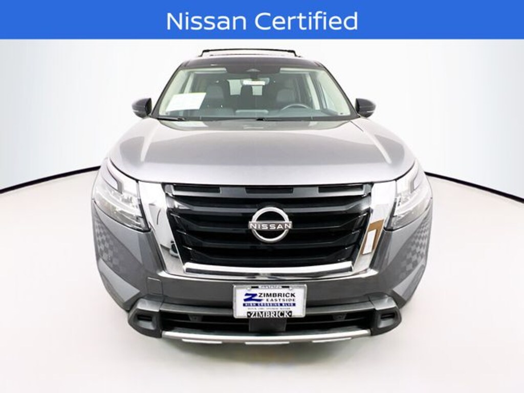 Certified. Gun Metallic/Super Black 2023 Nissan Pathfinder SL 4WD 9-Speed Automatic V6 20" Painted Alloy Wheels, 2nd-Row Captain Chairs, 2nd-Row Removable Center Console, Bose Premium Audio System, Heated Rear Seats, Panoramic Moonroof, SL Premium Package, Tow Hitch Receiver & Harness, 18" Machined Alloy Wheels, 3rd row seats: bench, 4-Wheel Disc Brakes, 6 Speakers, ABS brakes, Air Conditioning, Alloy wheels, AM/FM radio: SiriusXM, Auto High-beam Headlights, Auto-dimming Rear-View mirror, Automatic temperature control, Axle Ratio: 4.334, Black Splash Guards (Set of 4), Brake assist, Bumpers: body-color, Captain's Chairs Carpeted Floor Mats (Set of 4), Cross Bars, Delay-off headlights, Driver door bin, Driver vanity mirror, Dual front impact airbags, Dual front side impact airbags, Electronic Stability Control, Emergency communication system: NissanConnect Services, Exterior Parking Camera Rear, Four wheel independent suspension, Front anti-roll bar, Front Bucket Seats, Front Center Armrest, Front dual zone A/C, Front reading lights, Fully automatic headlights, Garage door transmitter: HomeLink, Heated door mirrors, Heated Front Bucket Seats, Heated front seats, Heated steering wheel, Illuminated entry, Knee airbag, Leather Seating Surfaces, Leather steering wheel, Low tire pressure warning, Navigation system: NissanConnect Navigation, NissanConnect w/Navigation & Services, Occupant sensing airbag, Outside temperature display, Overhead airbag, Overhead console, Panic alarm, Passenger door bin, Passenger vanity mirror, Power door mirrors, Power driver seat, Power Liftgate, Power passenger seat, Power steering, Power windows, Radio data system, Radio: AM/FM Audio System, Rear air conditioning, Rear anti-roll bar, Rear reading lights, Rear seat center armrest, Rear side impact airbag, Rear window defroster, Rear window wiper, Reclining 3rd row seat, Remote keyless entry, Security system, Speed control, Speed-sensing steering, Split folding rear seat, Spoiler, Steering wheel mounted audio controls, Tachometer, Telescoping steering wheel, Tilt steering wheel, Traction control, Trip computer, Turn signal indicator mirrors, Variably intermittent wipers, 20" Painted Alloy Wheels, 2nd-Row Captain Chairs, 2nd-Row Removable Center Console, Bose Premium Audio System, Heated Rear Seats, Panoramic Moonroof, SL Premium Package, Tow Hitch Receiver & Harness.