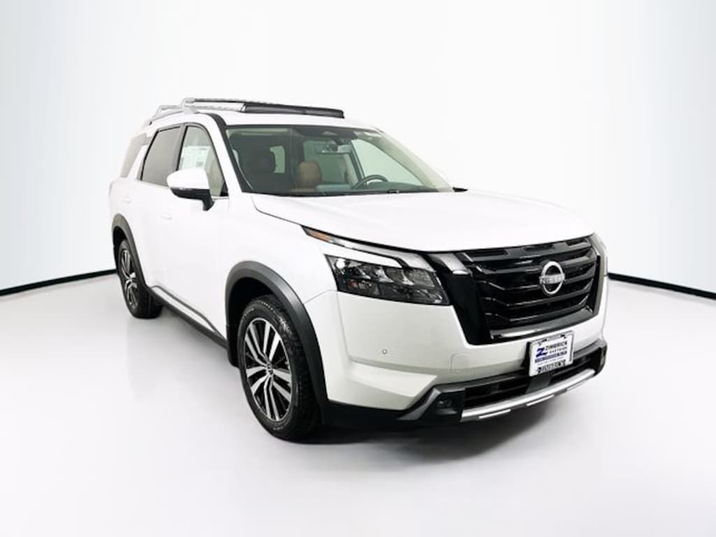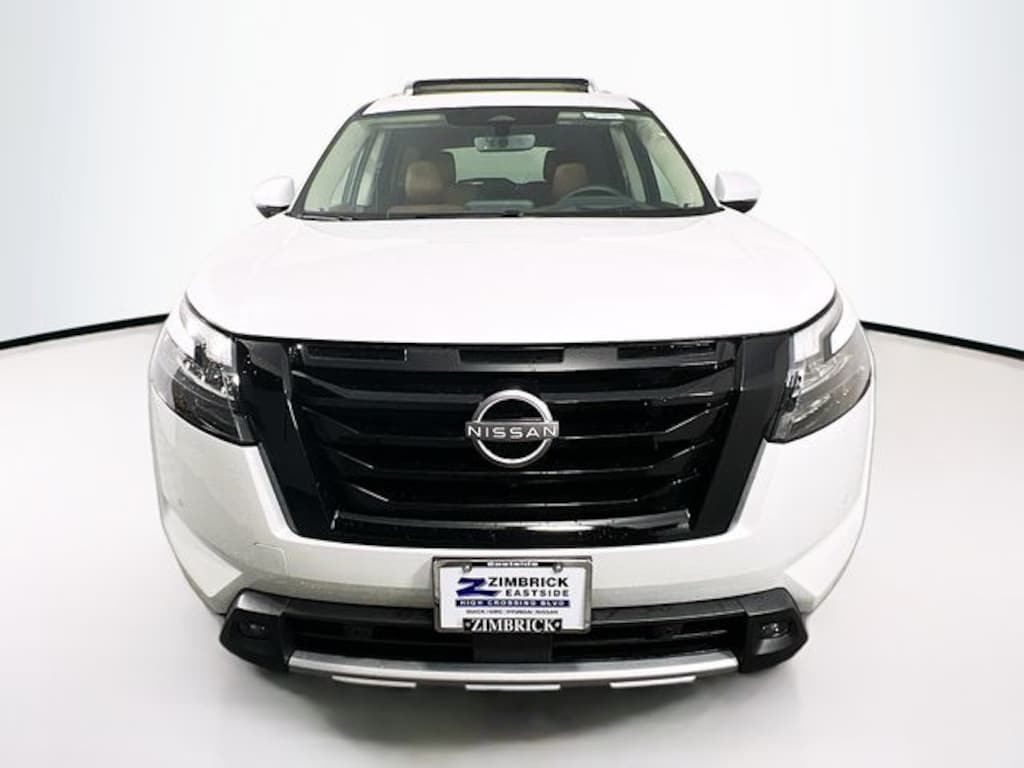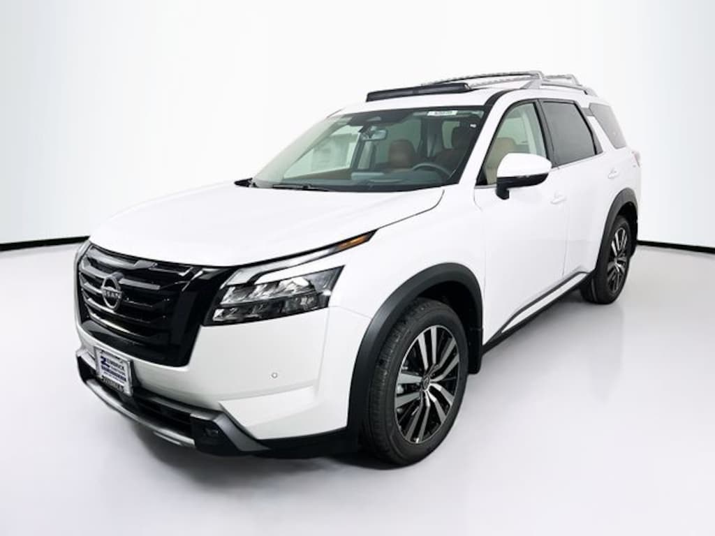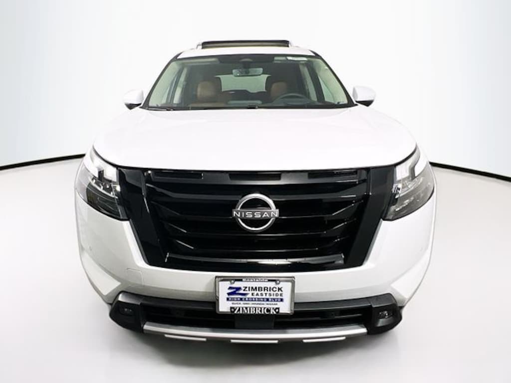 Everest White Pearl Tricoat 2025 Nissan Pathfinder Platinum 4WD 9-Speed Automatic 3.5L V6 DOHC 2nd-Row Captain Chairs, 2nd-Row Rear Headrest, Black Appearance Package, Black Grille, Black Liftgate Emblems, Cargo Area Protector, Cargo Net, Cargo Package, First Aid, Navigation system: NissanConnect with Navigation and Services, Platinum Captain Chairs Package, 13 Speakers, 3rd row seats: bench, 4-Wheel Disc Brakes, ABS brakes, Air Conditioning, Alloy wheels, AM/FM radio: SiriusXM, Auto High-beam Headlights, Auto tilt-away steering wheel, Auto-dimming Rear-View mirror, Automatic temperature control, Bodyside moldings, Bose Premium Audio System, Brake assist, Bumpers: body-color, Captain's Chairs Carpeted Floor Mats (Set of 4), Climate Controlled Front Bucket Seats, Cross Bars, Delay-off headlights, Driver door bin, Driver vanity mirror, Dual front impact airbags, Dual front side impact airbags, Electronic Stability Control, Emergency communication system, Exterior Parking Camera Rear, Four wheel independent suspension, Front anti-roll bar, Front Bucket Seats, Front Center Armrest, Front dual zone A/C, Front reading lights, Fully automatic headlights, Garage door transmitter: HomeLink, Heads-Up Display, Heated door mirrors, Heated front seats, Heated rear seats, Heated steering wheel, Illuminated entry, Knee airbag, Leather steering wheel, LED Fog Lamps, Low tire pressure warning, Memory seat, NissanConnect featuring Apple CarPlay and Android Auto, NissanConnect w/Navigation & Services, Occupant sensing airbag, Outside temperature display, Overhead airbag, Overhead console, Panic alarm, Passenger door bin, Passenger vanity mirror, Power door mirrors, Power driver seat, Power Liftgate, Power moonroof, Power passenger seat, Power steering, Power windows, Premium Paint, Radio data system, Radio: AM/FM Audio System, Rain sensing wipers, Rear air conditioning, Rear anti-roll bar, Rear reading lights, Rear seat center armrest, Rear side impact airbag, Rear window defroster, Rear window wiper, Reclining 3rd row seat, Remote keyless entry, Security system, Semi-Aniline Leather-Appointed Seating Surfaces, Speed control, Speed-sensing steering, Speed-Sensitive Wipers, Split folding rear seat, Spoiler, Steering wheel memory, Steering wheel mounted audio controls, Tachometer, Telescoping steering wheel, Tilt steering wheel, Traction control, Trip computer, Turn signal indicator mirrors, Variably intermittent wipers, Ventilated front seats, Wheels: 20" x 8J Machined Alloy, 2nd-Row Captain Chairs, 2nd-Row Rear Headrest, Black Appearance Package, Black Grille, Black Liftgate Emblems, Cargo Area Protector, Cargo Net, Cargo Package, First Aid, Navigation system: NissanConnect with Navigation and Services, Platinum Captain Chairs Package.