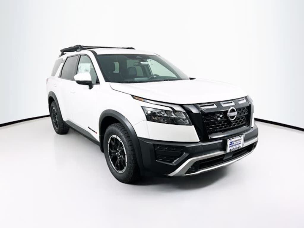 Glacier White 2025 Nissan Pathfinder Rock Creek 4WD 9-Speed Automatic 3.5L V6 DOHC 3rd row seats: bench, 4-Wheel Disc Brakes, 6 Speakers, ABS brakes, Air Conditioning, Alloy wheels, AM/FM radio: SiriusXM, Auto High-beam Headlights, Automatic temperature control, Black Splash Guards (Set of 4), Brake assist, Delay-off headlights, Driver door bin, Driver vanity mirror, Dual front impact airbags, Dual front side impact airbags, Electronic Stability Control, Emergency communication system, Four wheel independent suspension, Front anti-roll bar, Front Bucket Seats, Front Center Armrest, Front dual zone A/C, Front fog lights, Front reading lights, Fully automatic headlights, Heated door mirrors, Heated Front Bucket Seats, Heated front seats, Illuminated entry, Knee airbag, Leather steering wheel, Leatherette-Appointed Seating Surfaces, Low tire pressure warning, NissanConnect featuring Apple CarPlay and Android Auto, Occupant sensing airbag, Outside temperature display, Overhead airbag, Overhead console, Panic alarm, Passenger door bin, Passenger vanity mirror, Power door mirrors, Power driver seat, Power Liftgate, Power steering, Power windows, Radio data system, Radio: AM/FM Audio System w/NissanConnect, Rear air conditioning, Rear anti-roll bar, Rear Parking Sensors, Rear reading lights, Rear side impact airbag, Rear window defroster, Rear window wiper, Reclining 3rd row seat, Remote keyless entry, Rock Creek AS Floor Liners & Cargo Area Protector, Roof rack, Security system, Speed control, Speed-sensing steering, Split folding rear seat, Spoiler, Steering wheel mounted audio controls, Tachometer, Telescoping steering wheel, Tilt steering wheel, Traction control, Trip computer, Turn signal indicator mirrors, Variably intermittent wipers, Wheels: 18" x 8J Machined Alloy w/Black Finish.